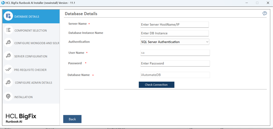 - To check the connectivity to a server using the credentials provided, click Check Connection. This displays a message for Connection Success or Connection Failure .