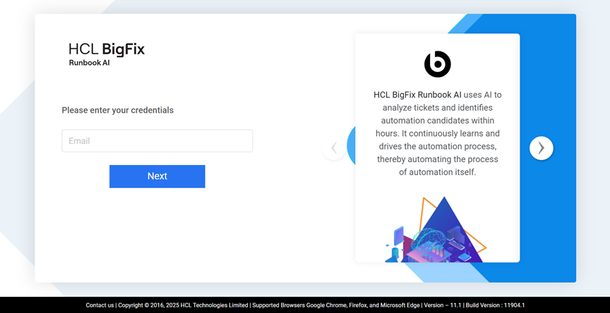 - Click OK to navigate to the BigFix Runbook AI Login Page.