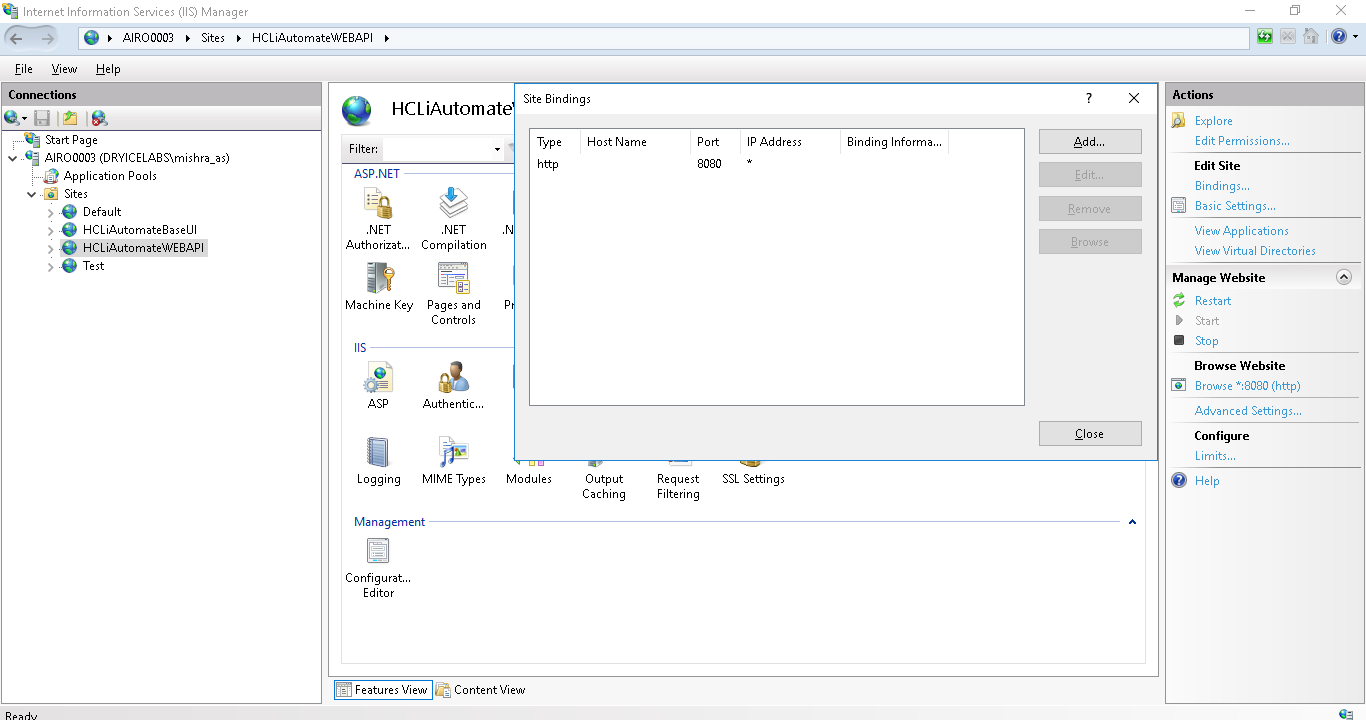 - Expand Sites in Connections section and click HCLiAutomateWEBAPI.