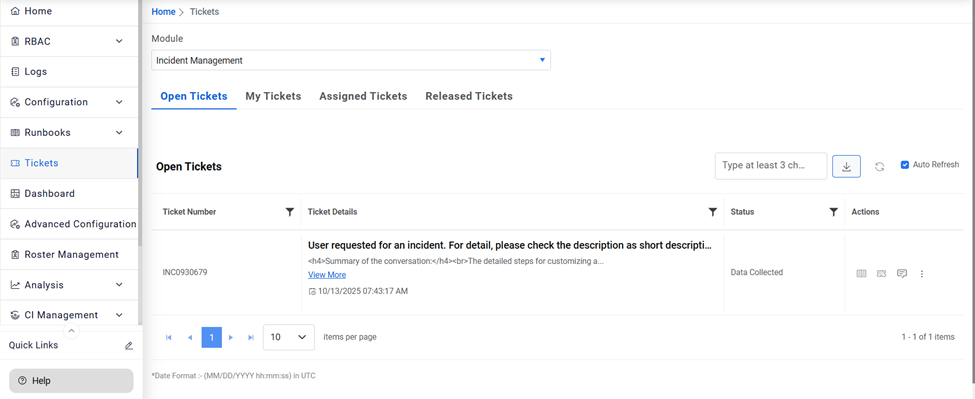 Tickets: Enables the users to view unresolved tickets and act. Based on confidence