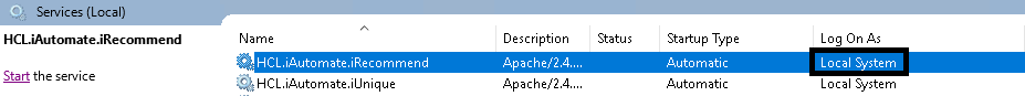 Local account. Refer to the figure below to check the status. Figure 1. HCL.iAutomate.iRecommend service is not starting