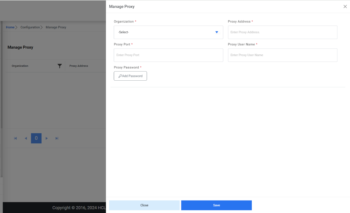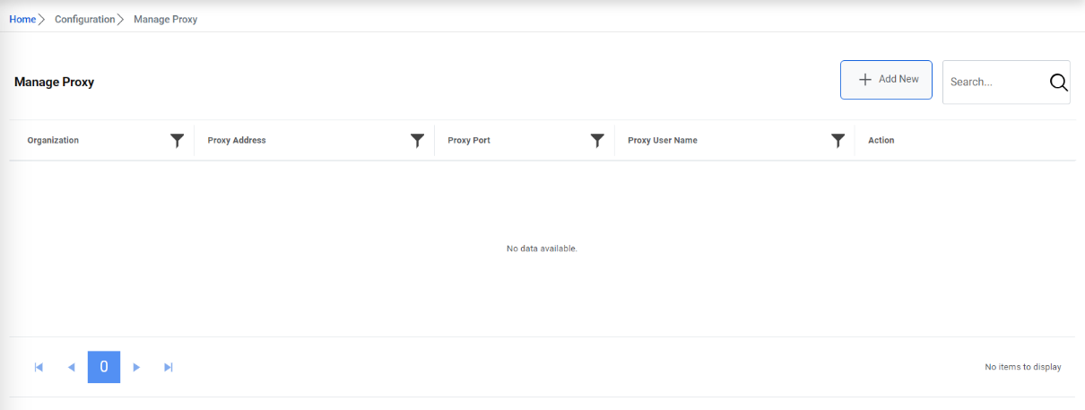- On the main menu bar, click Configuration and then click Manage Proxy. The Manage Proxy detail page appears.