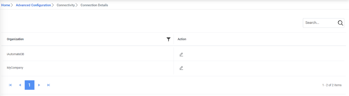 - Click the Edit icon under the Action tab to edit the details.Note:On the click of edit, the connection string will only be visible in the textbox if the below key is set to 'Y' in BaseUI’s web.config. If its value is ‘N’, then the Connection String textbox will be empty.