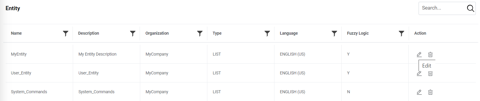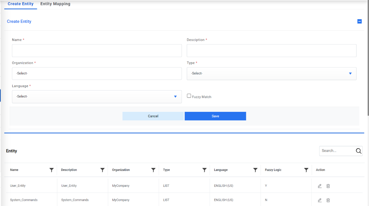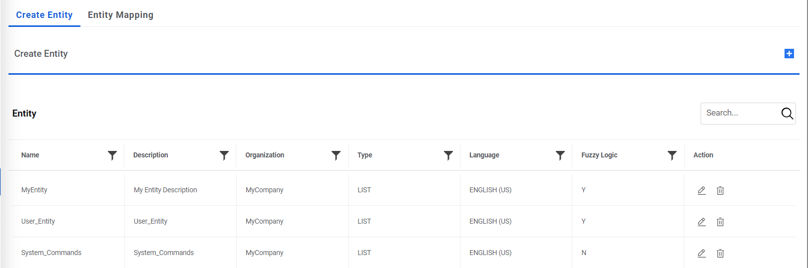- It lists the entities created in Entity Creation tab in a tabular view.