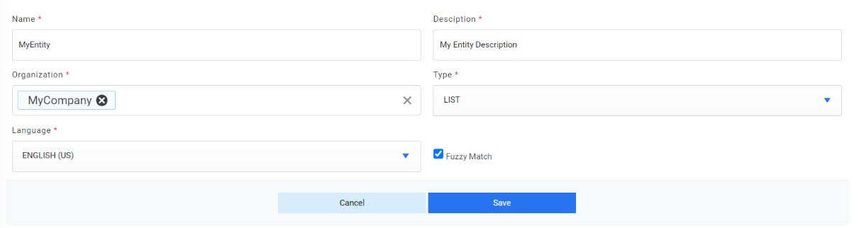 - On the Entity Creation page, type the entity name in the Name field, and then describe the entity in the Description field.