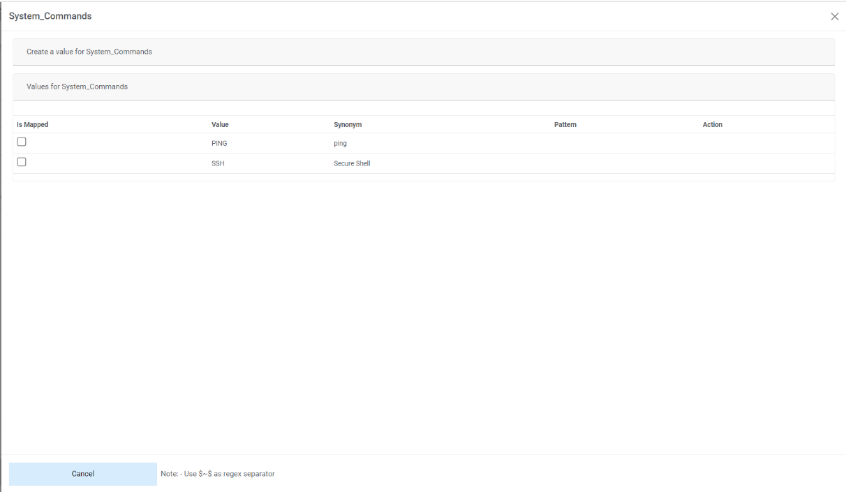 - A page appears for you to type the Value Name, Synonym, and Pattern (or regular expression).
