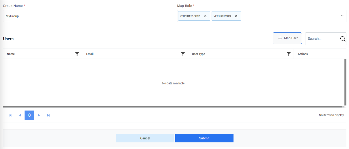 - Enter the Group Name, map roles to the group and click Submit. The newly