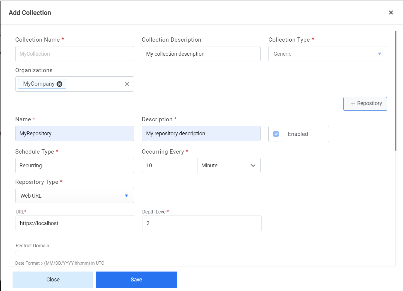 Select Restrict Domain checkbox to filter for documents of the same domain as mentioned in the URL.