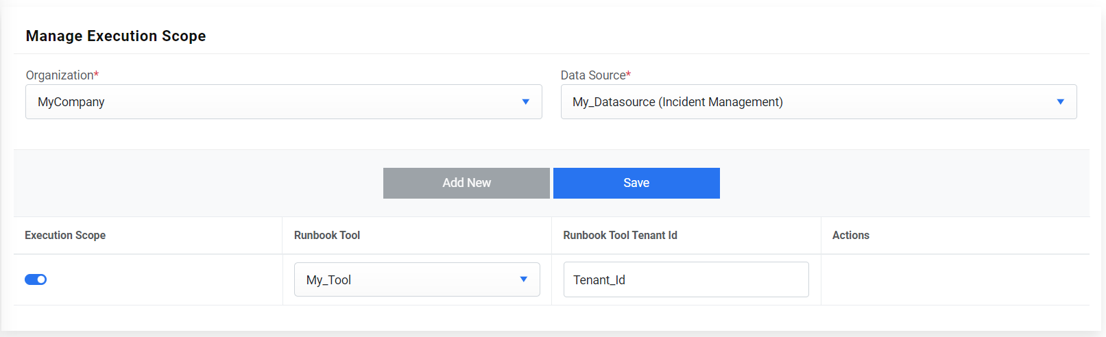 Execution scope specifies the rules set up to execute a ticket on a runbook tool. User can also define the execution scope for a data source in an organization.