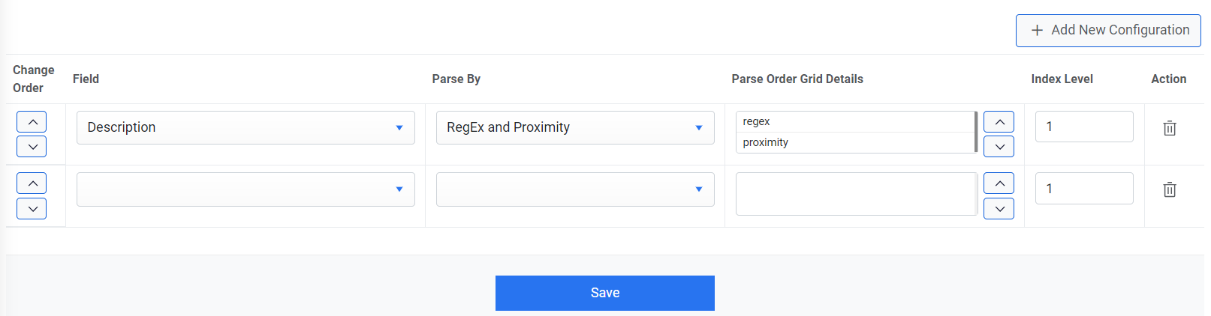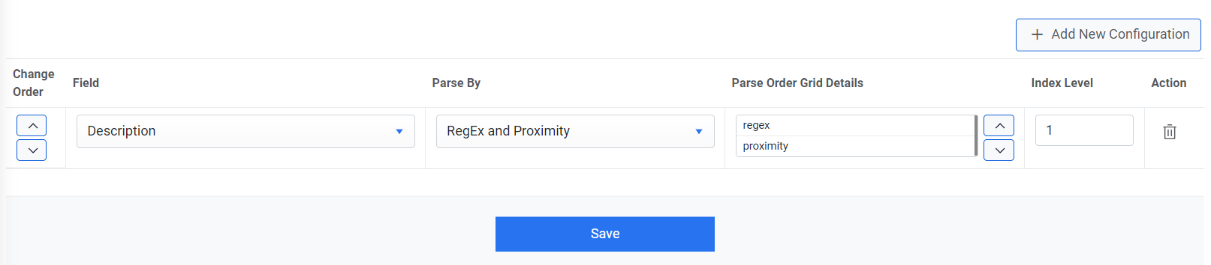 - The Parse Order Grid Details field specifies the parse order in case of selecting Regex and Proximity.