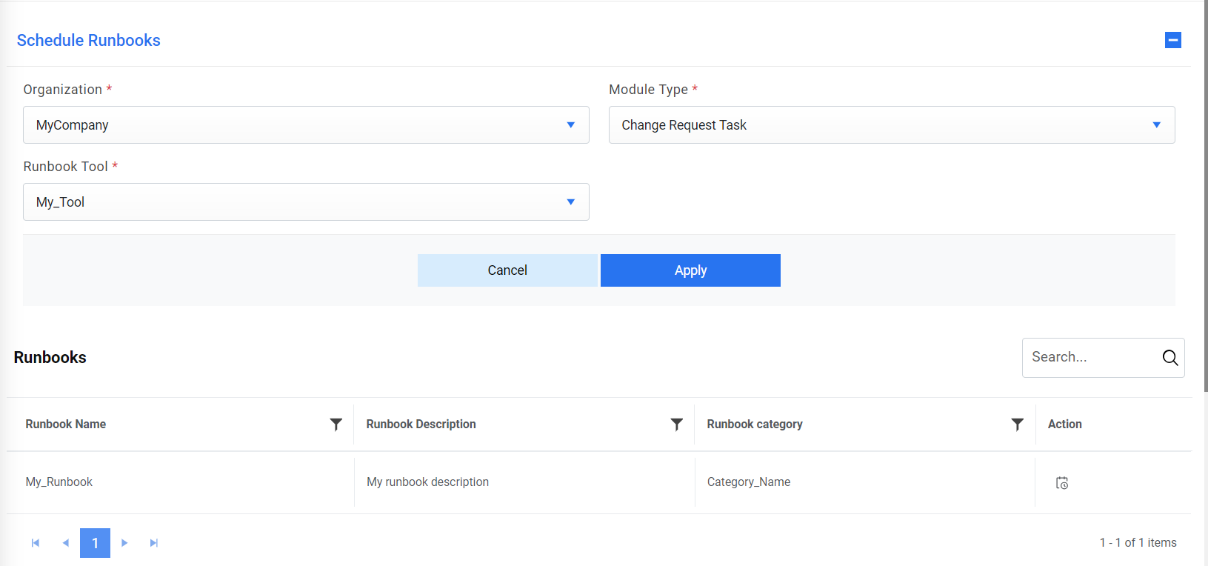 Apply. It lists all the runbooks configured with the selected Runbook tool in a