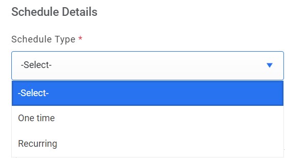 - Select One time or Recurring from the Schedule Type drop-down menu to