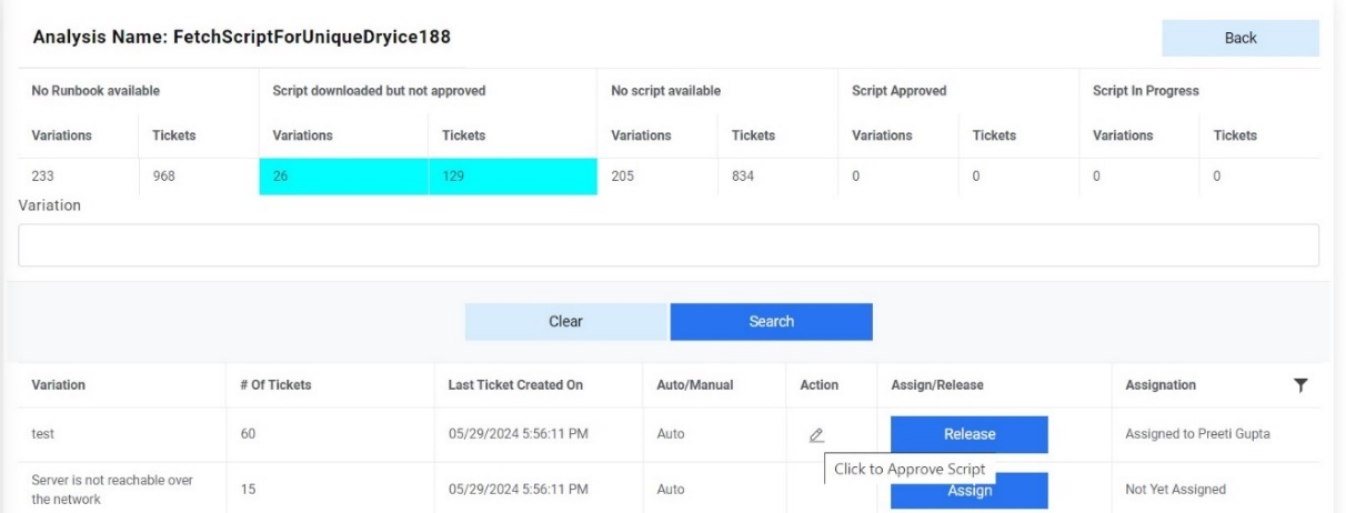 Note:Choose Clear to cancel the search. - To allow the variation to be used for script analysis, click Assign and the