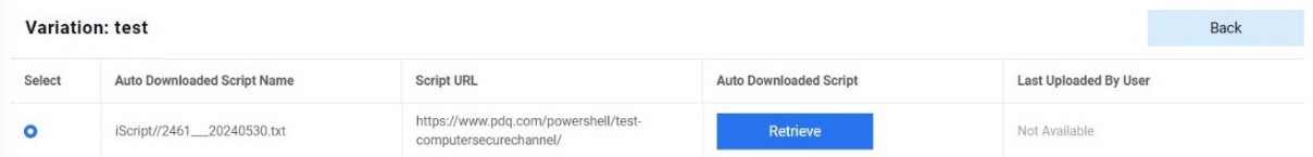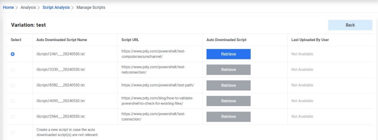 next to the analysis type you want to approve. - The Manage Scripts page appears and lists the available variations in a tabular