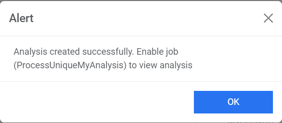 Note:On clicking Start Analysis, three new jobs are created. These are Unique Clustering, Unique Script, and Recommendation. The newly added analyses are listed in the Manage Jobs page. - To enable the job to view analysis, go to the Manage Jobs page.