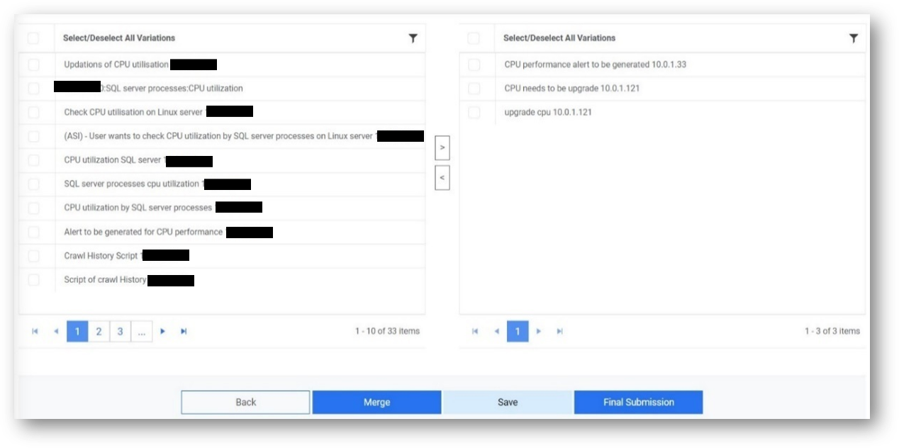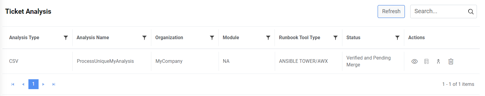 Note:Only tickets with Pending Merge status can be merged using this option. - The Merge Analysis page lists all the configured variations in a tabular