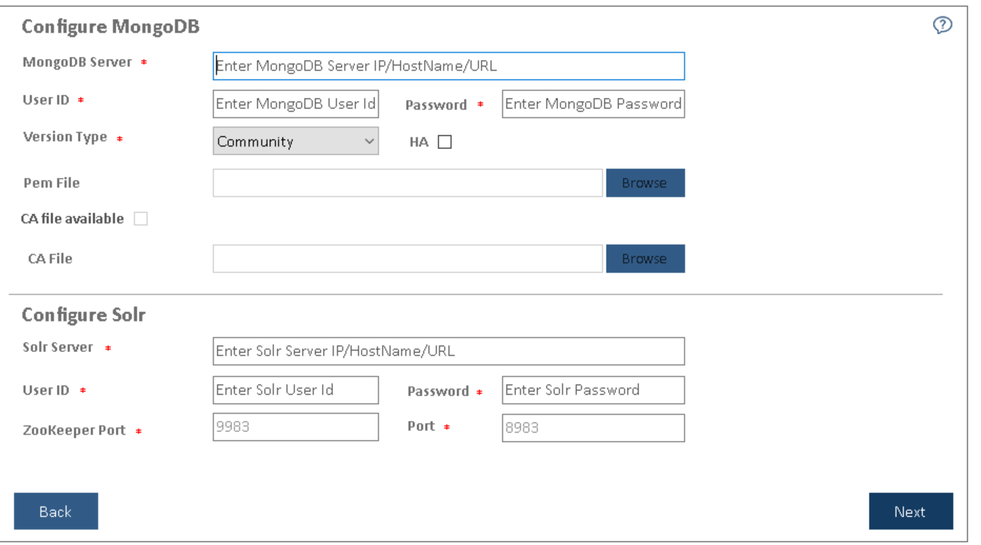 - To continue with the installation, click Next. This enables the Configure MongoDB and Solr tab on the left navigation pane. Type the following details to set up the MongoDB and Solr databases: