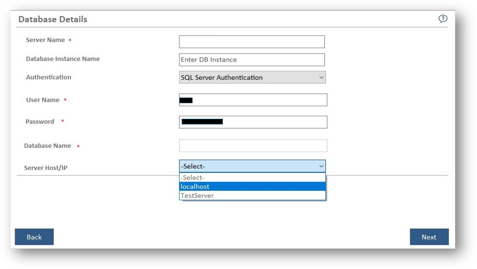 Note:It is recommended to use windows authentication in production environment. - In the UserName and Password fields, type username and password to access the server.