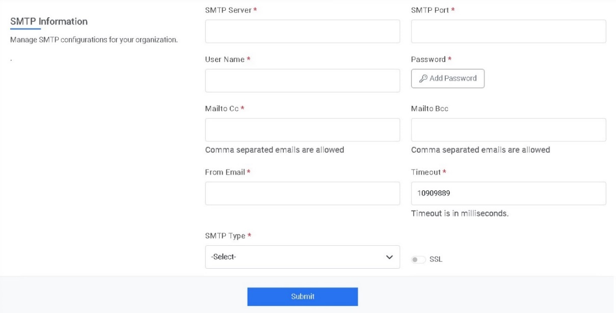 - On the main menu bar, click Configuration and then click Manage SMTP. The