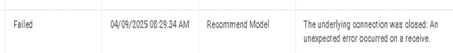 Recommend model Failed with error message “The underlying connection was closed: An unexpected error occurred on a receive”.