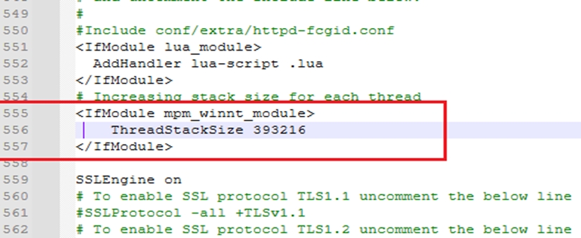 The build model will fail if the 'threadstacksize' lines are not found in the .conf files in apache.