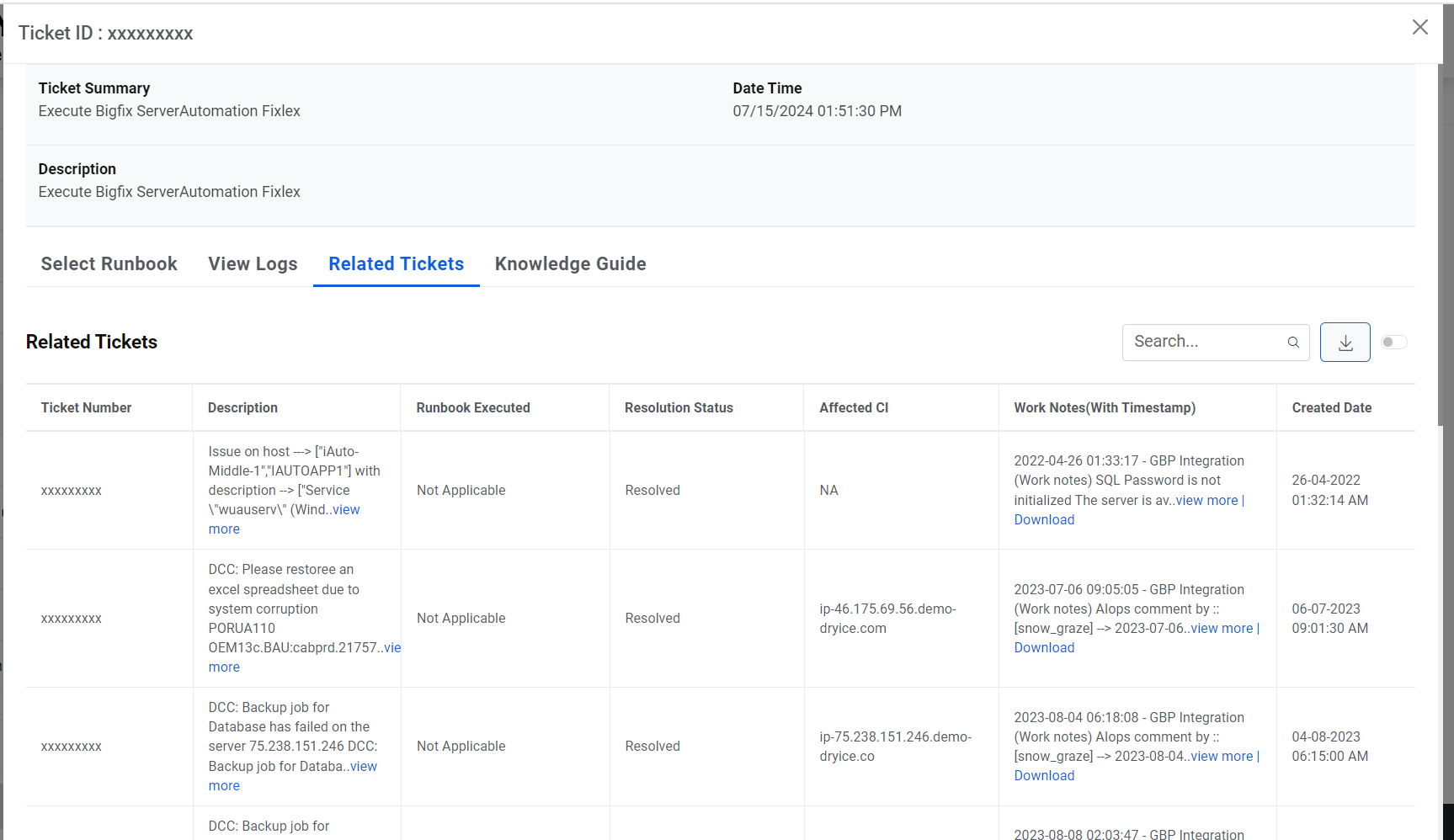 - Ticket Details: Provides information about a request, including the ticket description, summary, identification number, and the creation date. Selecting a ticket’s Incident ID displays the ticket detail in the Logs tab.