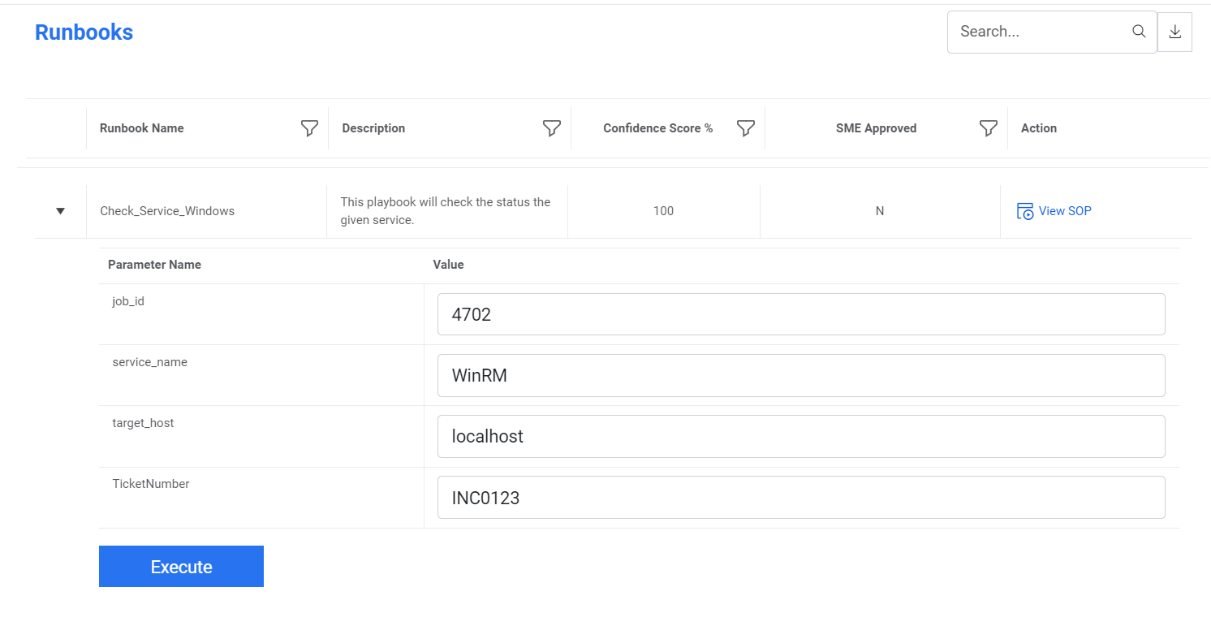 - In addition to the confidence score, the SME Approved column displays the result of SME validation against the runbooks. Both parameters help the user to identify the runbook for execution.