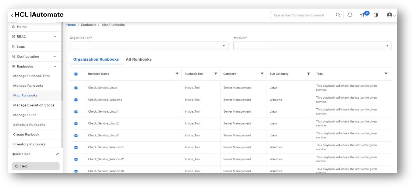 - Click All Runbooks tab and select the runbooks to be mapped.