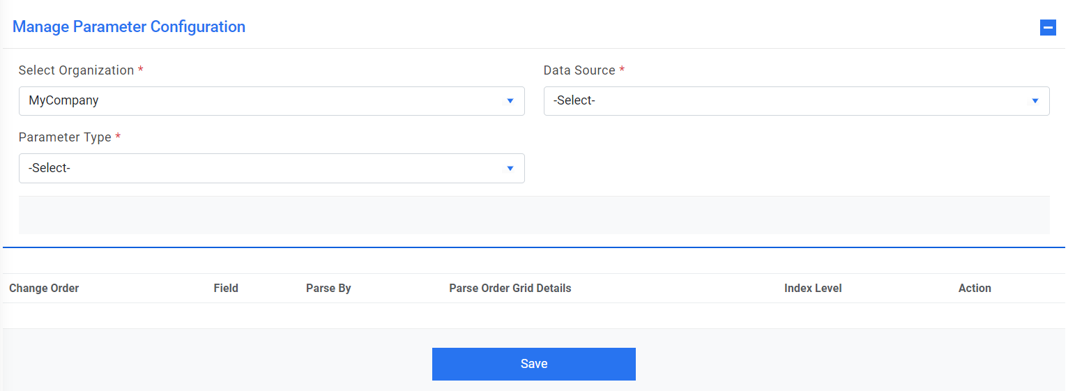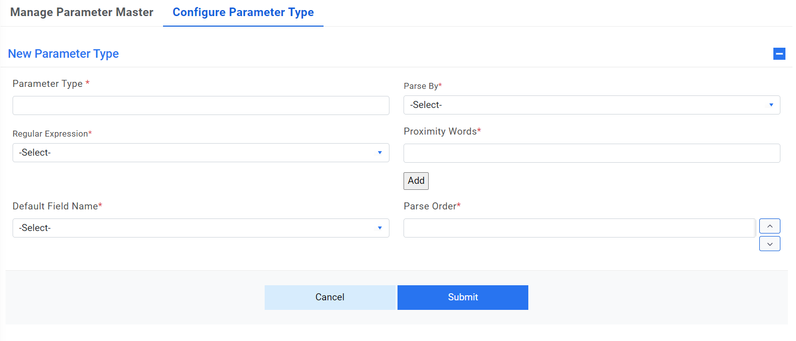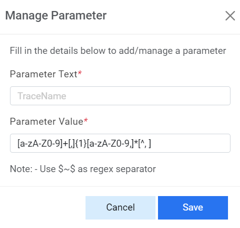 - Manage Parameter Master – Defines regular expression for parameter to be parsed. It should be unique to parameter type.