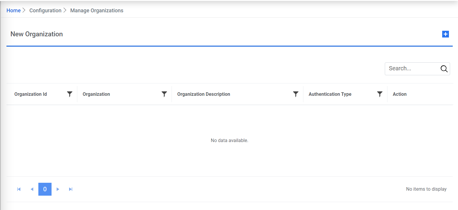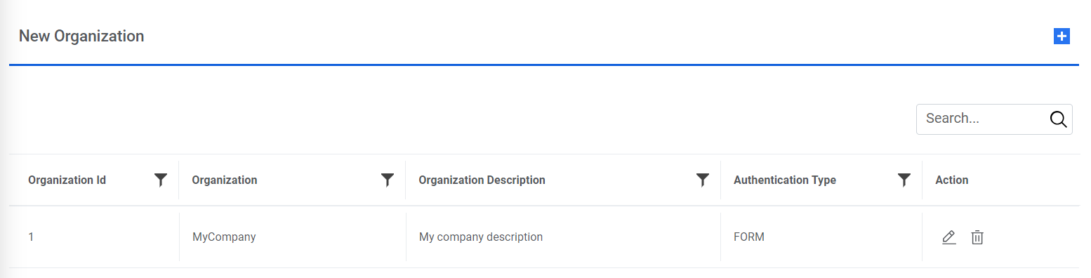 - A list of available organizations with the newly created MyCompany organization will be visible in the list. You can edit the information or delete the organization by clicking on the respective icons under Action section.