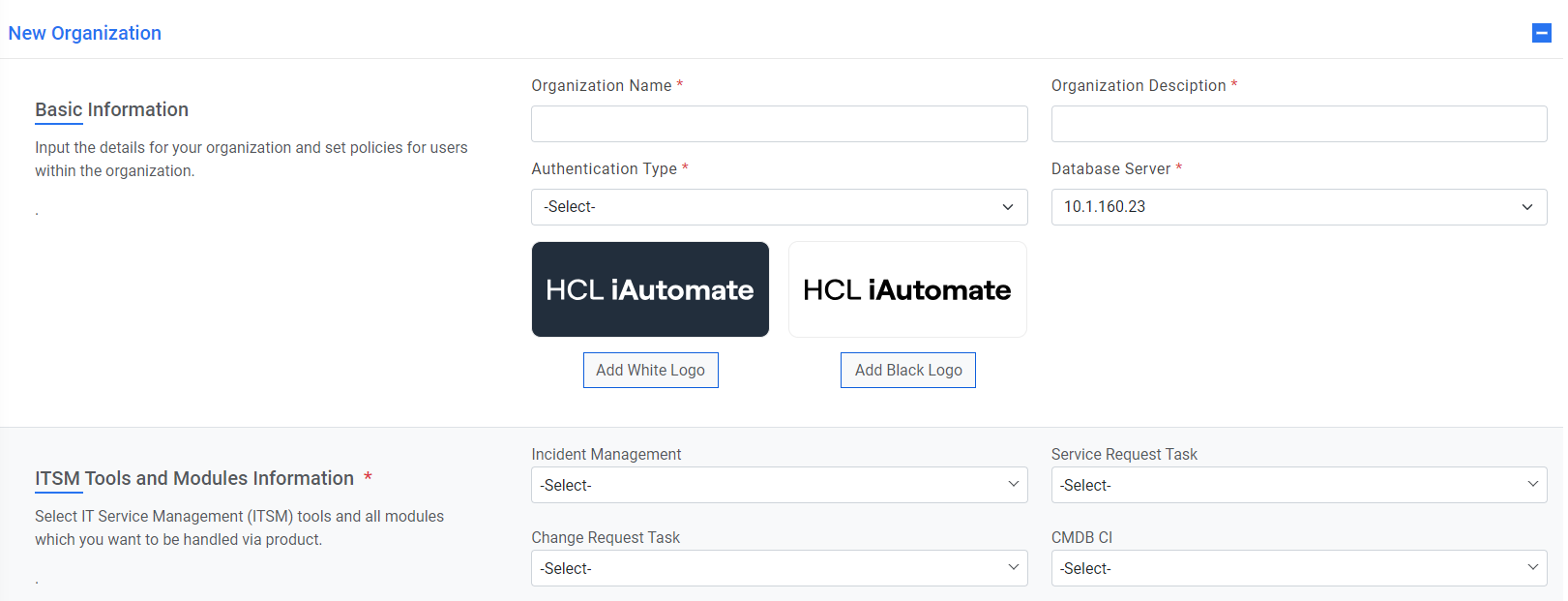 - Go to Actions -> Manage Organizations menu and expand New Organization.