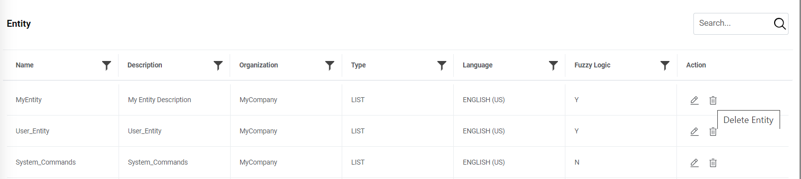 - It lists the entities created in Entity Creation tab in a tabular view.