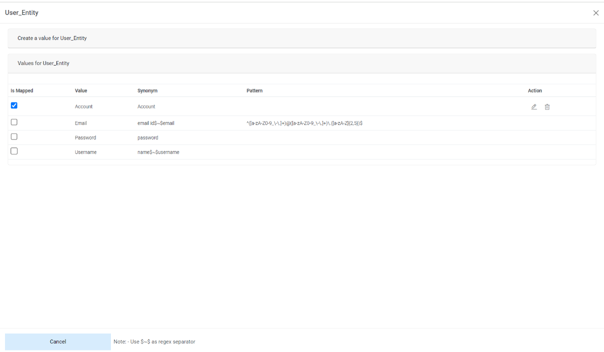 - A page appears for you to type the Value Name, Synonym, and Pattern (or regular expression).
