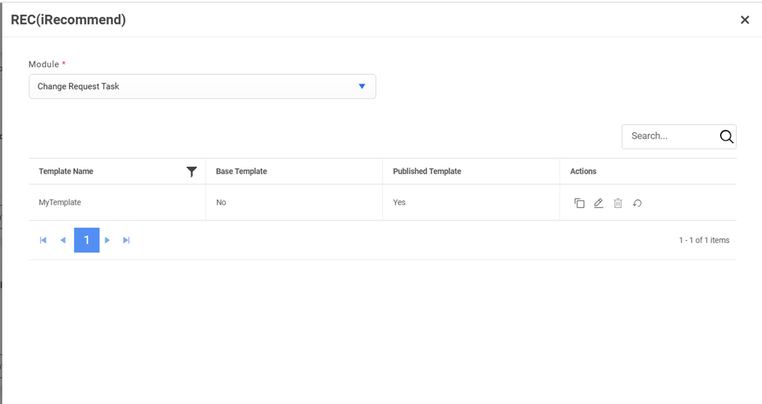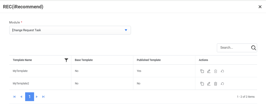 This lists the default base template and existing templates for the selected component if there are any. These templates provide a starting point for users to create a template by replicating or cloning them. It also enables a user to edit or delete the existing templates.