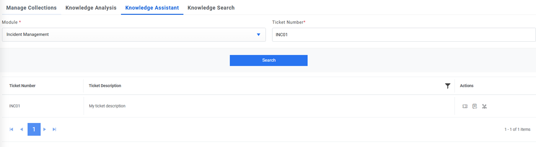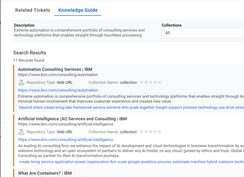 This section provides the user with the relevant knowledge recommendations based on the ticket descriptions. This includes: