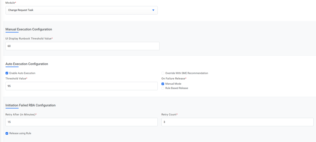 To configure manual execution for tickets, perform the following steps:- Type the threshold value next to the UI Display Runbook Threshold Value field.