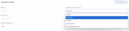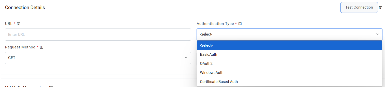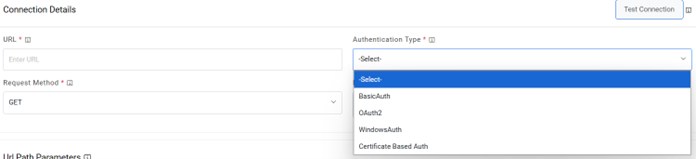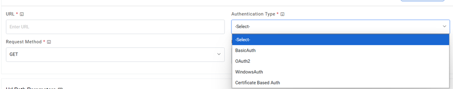 Note:User can apply multiple clauses into the URL to display only the required parameter into the placeholder. Once you hit the URL, only the placeholders with a hashtag will be displayed with the associated parameters in the URL Path Parameters column. Whenever user wants to change the data to be filtered, always change the logic in the URL to get the specific parameters. - Select the Authentication Type. iAutomate supports the following types of