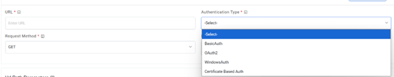 Note:Users can apply multiple clauses into the URL to display only the required parameter into the placeholder. Once you hit the URL, only the placeholders with a hashtag will be displayed with the associated parameters in the URL Path Parameters column. Whenever a user wants to change the data to be filtered, always change the logic in the URL to get the specific parameters. - Select the Authentication Type. iAutomate supports the following types of