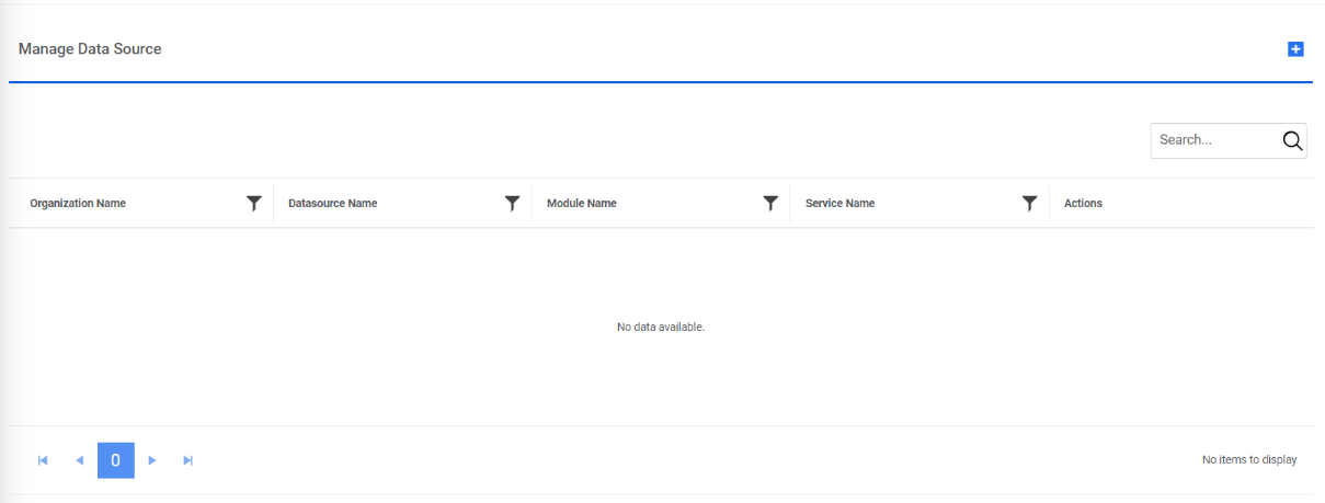This lists the available data sources in a tabular view with their associated organization, module, and service type. Users can create a new data source by clicking Manage Data Sources. Users can also edit or delete the data source and manage the entry criteria for the data source.
