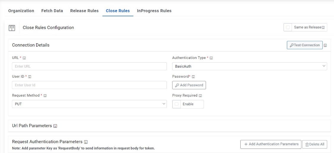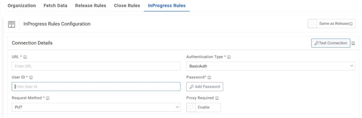 - On the InProgress Rules Configuration page, click on Same as Release if similar configurations as mentioned in “Release Rules Configuration” are required, else proceed ahead.