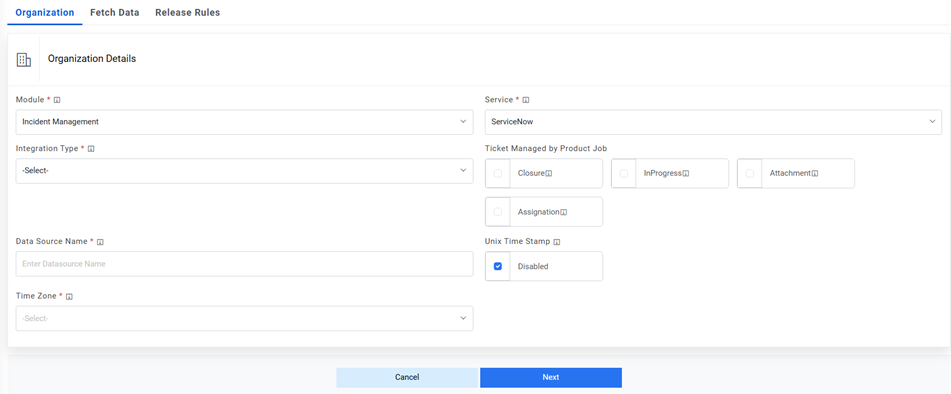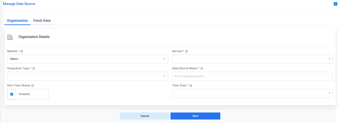 Users can set up organization details, for which the data source will be created, by performing the following steps: