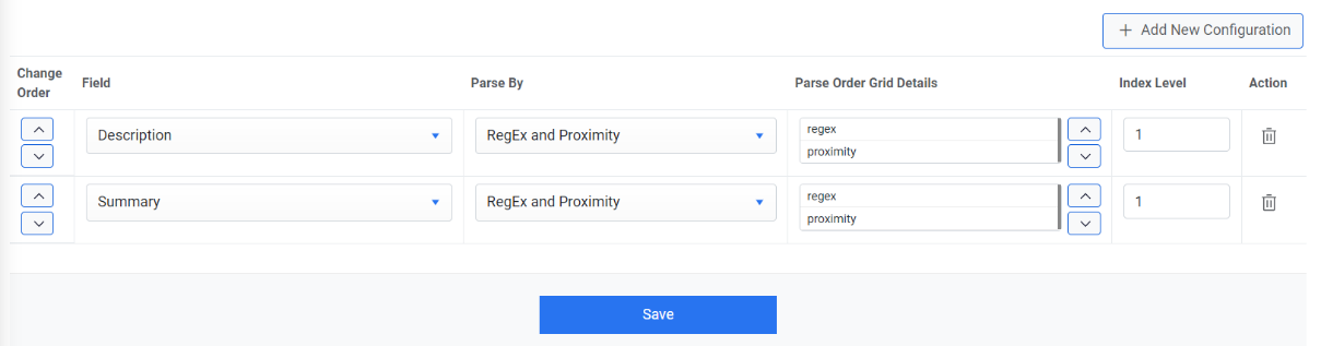 - The Parse Order Grid Details field specifies the parse order in case of selecting Regex and Proximity.