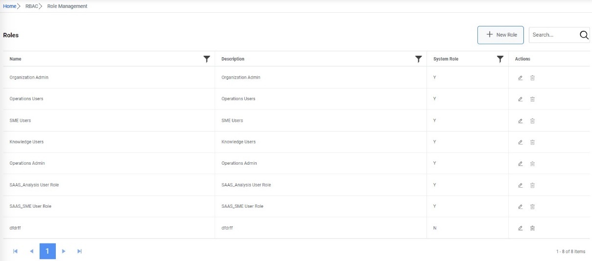 - The Status column displays the active or inactive status of the roles as Y or N. The System Role column denotes the default role that cannot be deleted from the environment as Y and editable roles that can be deleted as N.