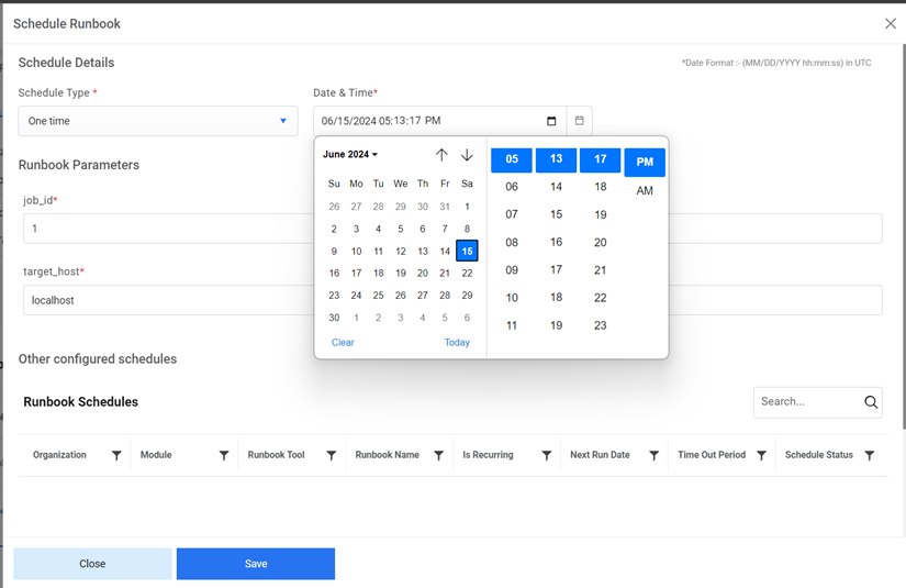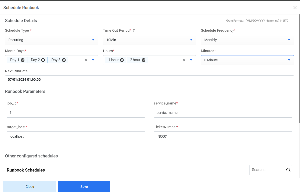 iAutomate allows users to schedule runbooks to run at a specified time. A runbook can be scheduled to run once or on a recurring basis.