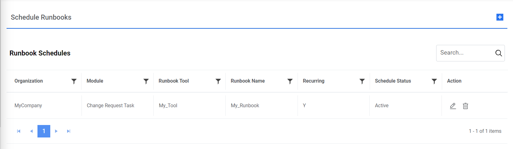 - The Runbook Schedule page enables users to edit or delete existing schedules.Note:One-time schedule type Runbook cannot be edited. In case the user needs to modify it, it will have to be added as a new entry through Schedule Runbook