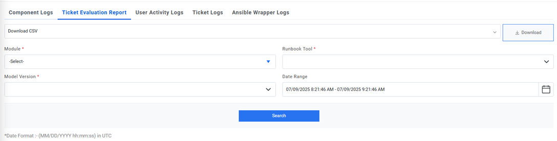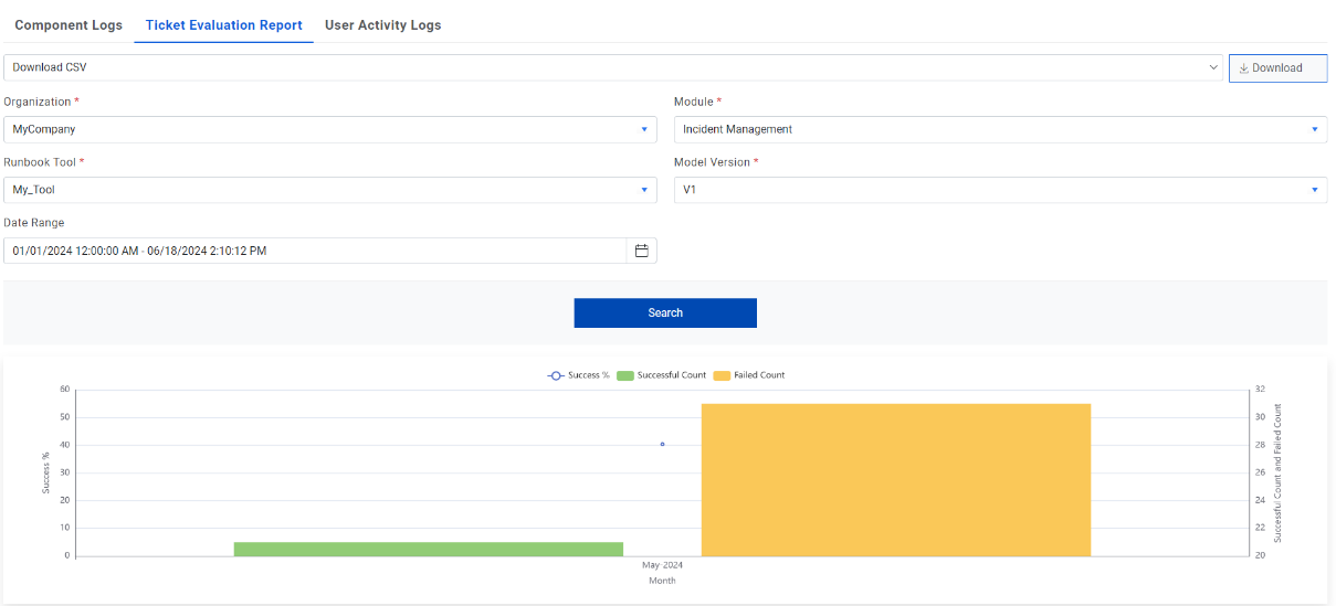 - Select Module, Runbook Tool, Model Version, and the time for which user needs to see the data.