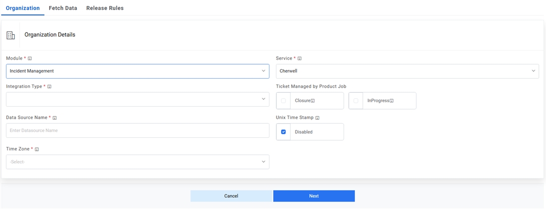Note:Release Rules are only applicable for the following Module types- Incident Management, Change Request Task and Service Request Task. This tab will not be activated for other module types. - On the Organization tab,