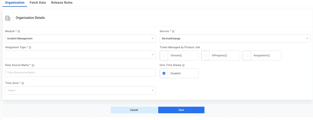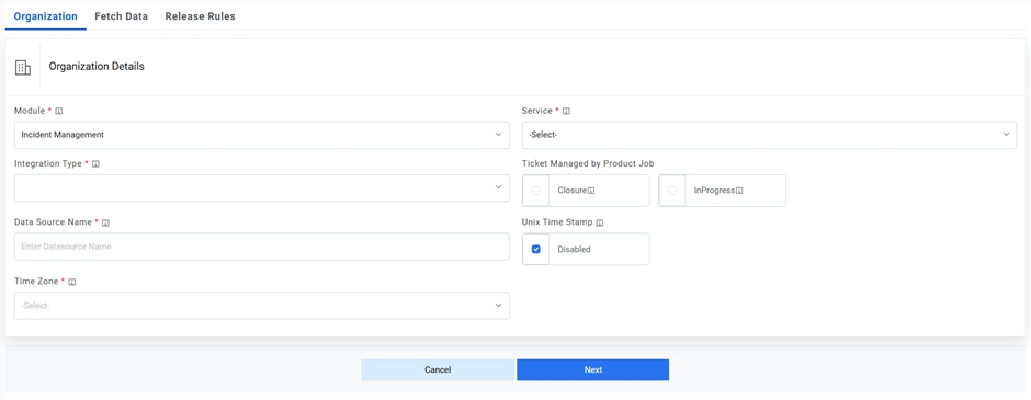 Please note that for integration with Event Management tool; while creating the organization, users need to select the Event Management tool from the dropdown.