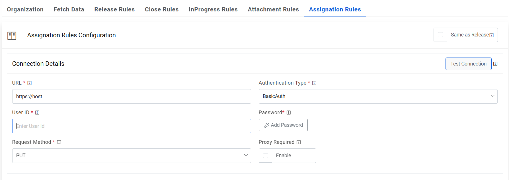 - On the Assignation Rules tab, type in the details as per the requirement. Check Same as Release of similar configurations as mentioned in “Release Rules Configuration” are required, else proceed ahead.