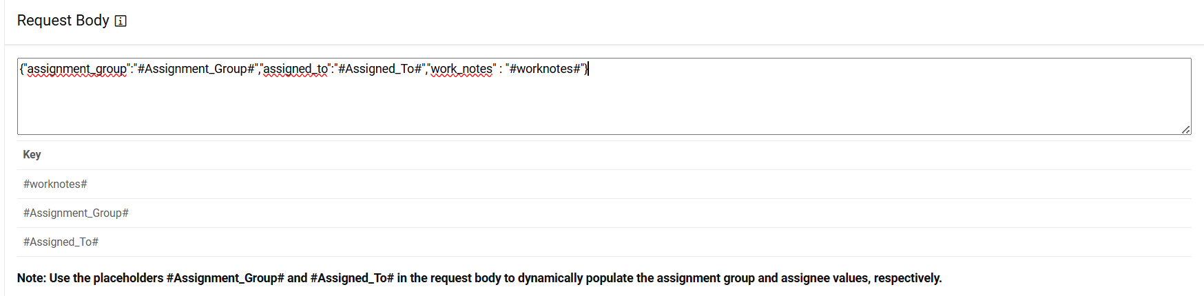 Request Body – {"assignment_group":"#Assignment_Group#","assigned_to":"#Assigned_To#","work_notes" : "#worknotes#"}Figure 41. Assignation Rules (Request Body)